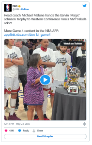 尽管在赛后的西区冠军颁奖典礼中,站在台上的约基奇一度被拍下穿不下西区冠军纪念T恤的尴尬画面,不过无损他在季后赛为自己挣回的名声,队友葛登说:「约柯奇就是一名篮球大师,你也可以说他是一名学者,此外,场下的他也是一个很有深度的人。」
