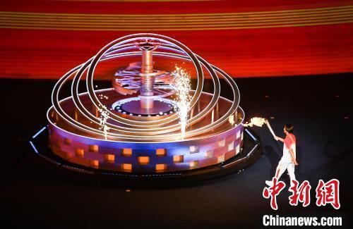 图为主火炬手、北京冬奥会冠军苏翊鸣点燃火炬塔。